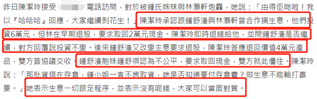 鍾舒漫 Sherman與陳潔玲 Christy 早前合作投資經營防疫產品生意卻因錢銀問題而鬧上法庭鍾舒漫入稟小額錢債審裁處向陳潔玲追討港幣44286元本金由於雙方拒絕和解案件今日早上於西九龍法院大樓開審. 陳潔玲宣布與畫家男友Victor已正式拉埋天窗圖片來源陳潔玲 IG 從此以後甘苦與共 陳潔玲Christy和鍾舒漫Sherman去年因金錢糾紛而鬧上法庭上月二人更展開隔空罵戰力.