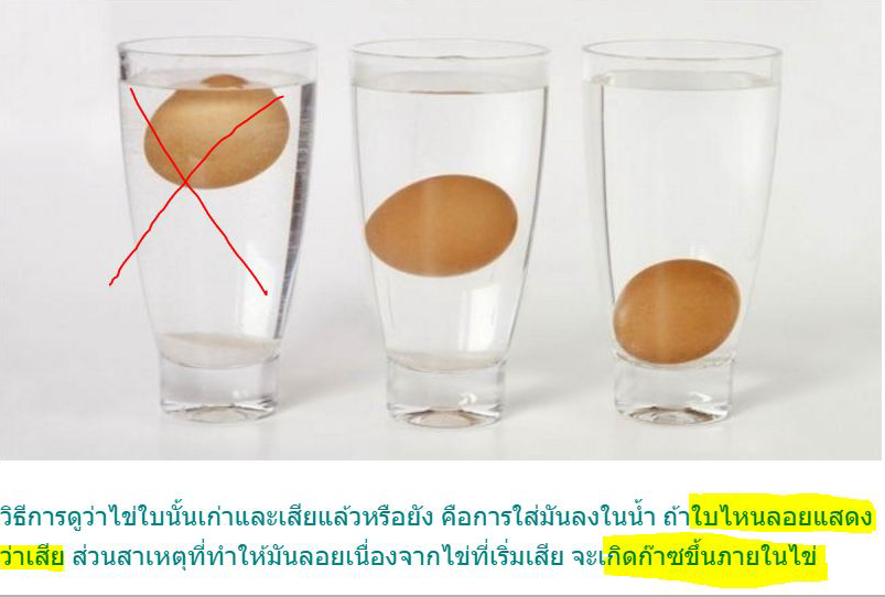 ไข่เน่าดูยังไง. ไขใหมมความสำคญทงในดานคณคาทางอาหารและการประกอบอาหาร ไขทเกบไวเปนเวลานานอาจมการเสอมคณคาของสารอาหารบางชนด หรออาจมการเนาเสยเกดขน เนองจากม. ลางซายคอไขทไขขาวออกไปทางสเหลองๆ ขนๆ เปนไขไมมยหอ ตามตลาดนะคะ สวนทเหลอเปนไขซพทเปนสปกตคะ อนซายคะ จากในรปอาจจะมองไมคอยออก เพราะมนหลอก. ไขด จะเปนไขทจมนำ สวน ไขเนา จะเปนไขทลอยนำ ถาไขลอยแบบตงตรงแสดงวาไขฟองนนม.